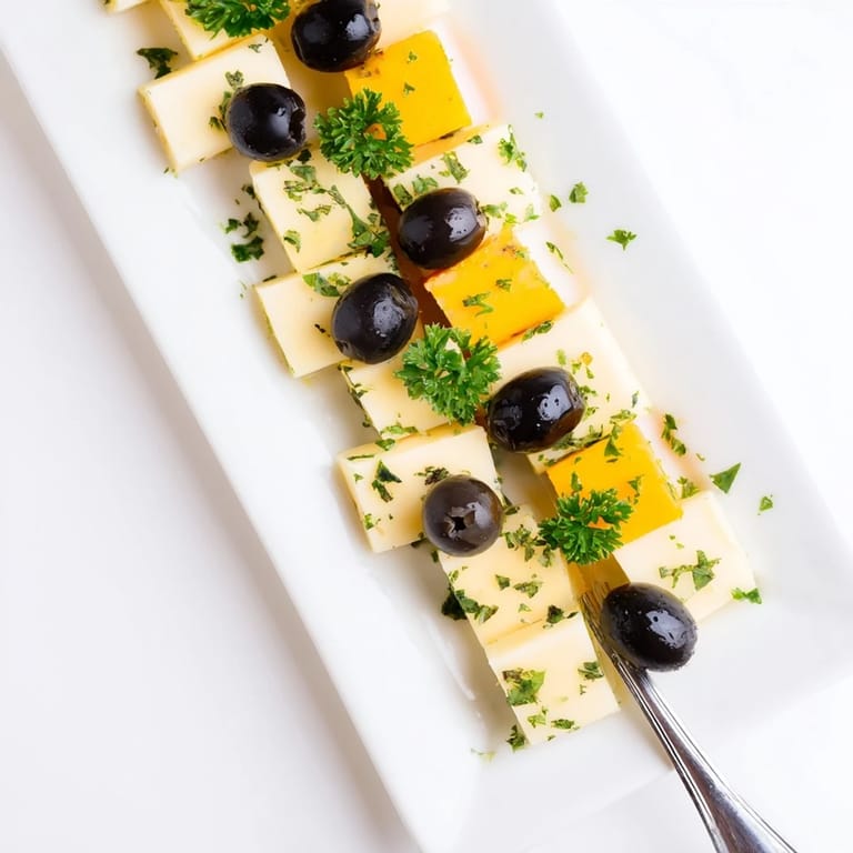 Save to Pinterest A visually striking appetizer featuring alternating cubes of cheese and olives arranged like a chessboard. Perfect for parties and gatherings.