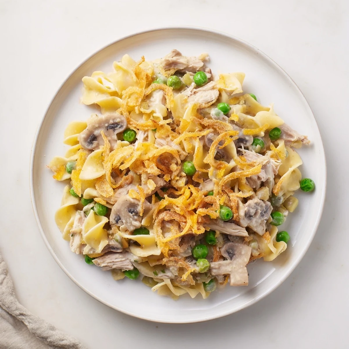 Save to Pinterest A comforting classic casserole featuring tender egg noodles, savory tuna, and a rich creamy sauce, all topped with golden crispy onions for irresistible crunch.