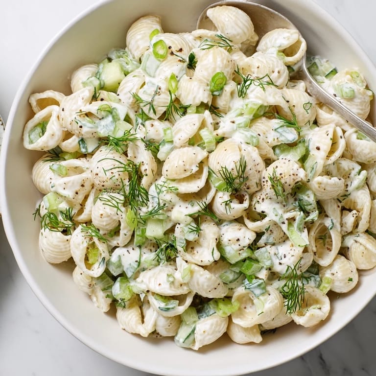 - Gently fold cooled pasta, cucumber, green onions, and dill into that luscious dressing. Treat it carefully so you do not crush those tender shells.