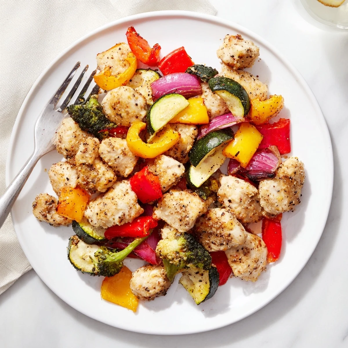 Save to Pinterest Juicy chicken bites tossed with garlic, Parmesan, and herbs, roasted alongside colorful vegetables for a quick and flavorful one-pan meal.