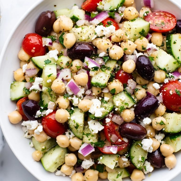 Save to Pinterest There's something about assembling a Mediterranean salad that feels less like cooking and more like painting with vegetables. I first discovered this combination on a lazy summer afternoon when my fridge held the scattered remnants of a farmers market visit—nothing coordinated, everything beautiful. I'd thrown chickpeas, cucumbers, and tomatoes into a bowl out of pure necessity, then made a quick lemon dressing while standing barefoot on the kitchen tile. That meal tasted like relief and sunshine, and I've been making versions of it ever since.