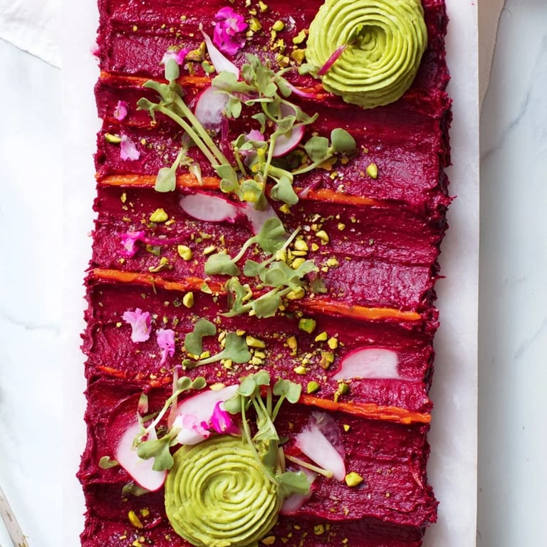 The beet-carrot-avocado combination is a starting point, not a rule. I've made this with roasted sweet potato purée instead of beets, and it was just as striking. Pea purée in the spring, roasted squash in autumn—any colorful vegetable that blends smooth enough to spread will work. The real skill is thinking about how the colors interact and what textures would make each spoonful interesting rather than just pretty.