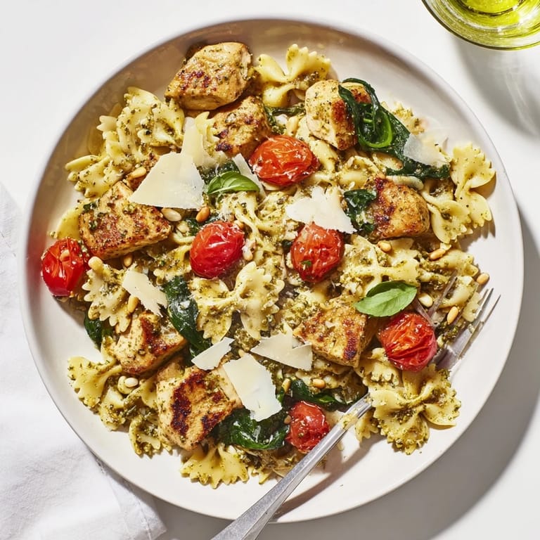 Save to Pinterest A vibrant, flavorful pasta dish featuring tender chicken, bowtie pasta, and a creamy basil pesto sauceβperfect for a quick weeknight dinner.