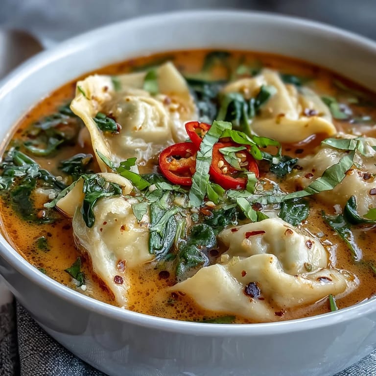 Save to Pinterest One Tuesday evening when my fridge was nearly bare, I found a box of frozen wontons shoved behind the ice packs and a can of coconut milk I'd forgotten about. Instead of the usual ramen routine, I grabbed some red curry paste from the pantry and decided to improvise. Twenty minutes later, I was ladling this vibrant, steaming soup into bowls while my roommate appeared in the kitchen drawn by the smell of ginger and lime. That spontaneous bowl became the template for countless quick dinners since.