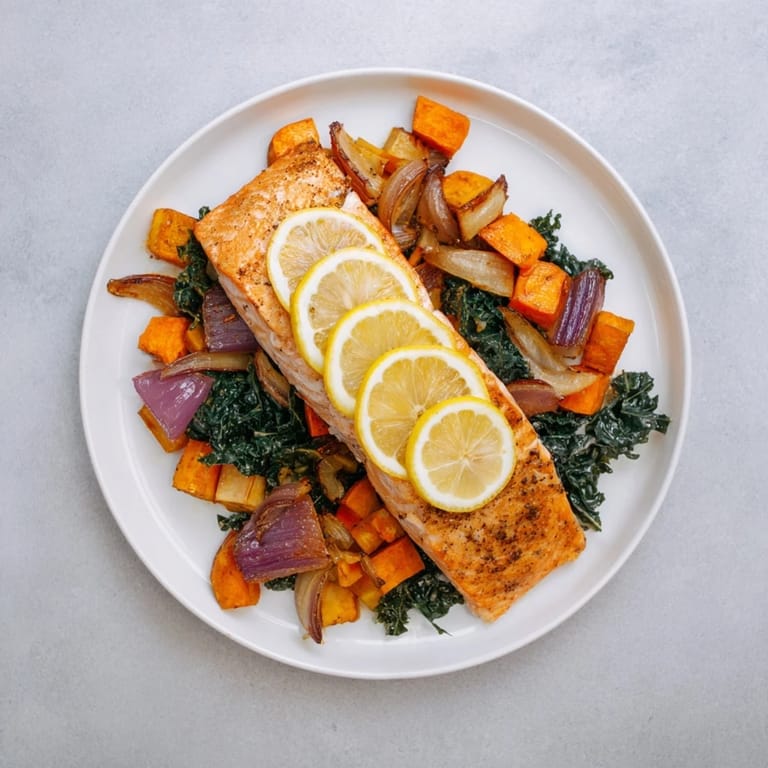 Save to Pinterest A vibrant, nourishing dish featuring flaky roasted salmon paired with caramelized winter root vegetables and hearty greens, all baked together on a single pan for easy preparation and cleanup.