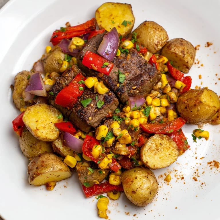 Save to Pinterest A hearty, flavorful one-pan dish combining tender steak, crispy potatoes, and vibrant Southwestern spices for a satisfying meal.